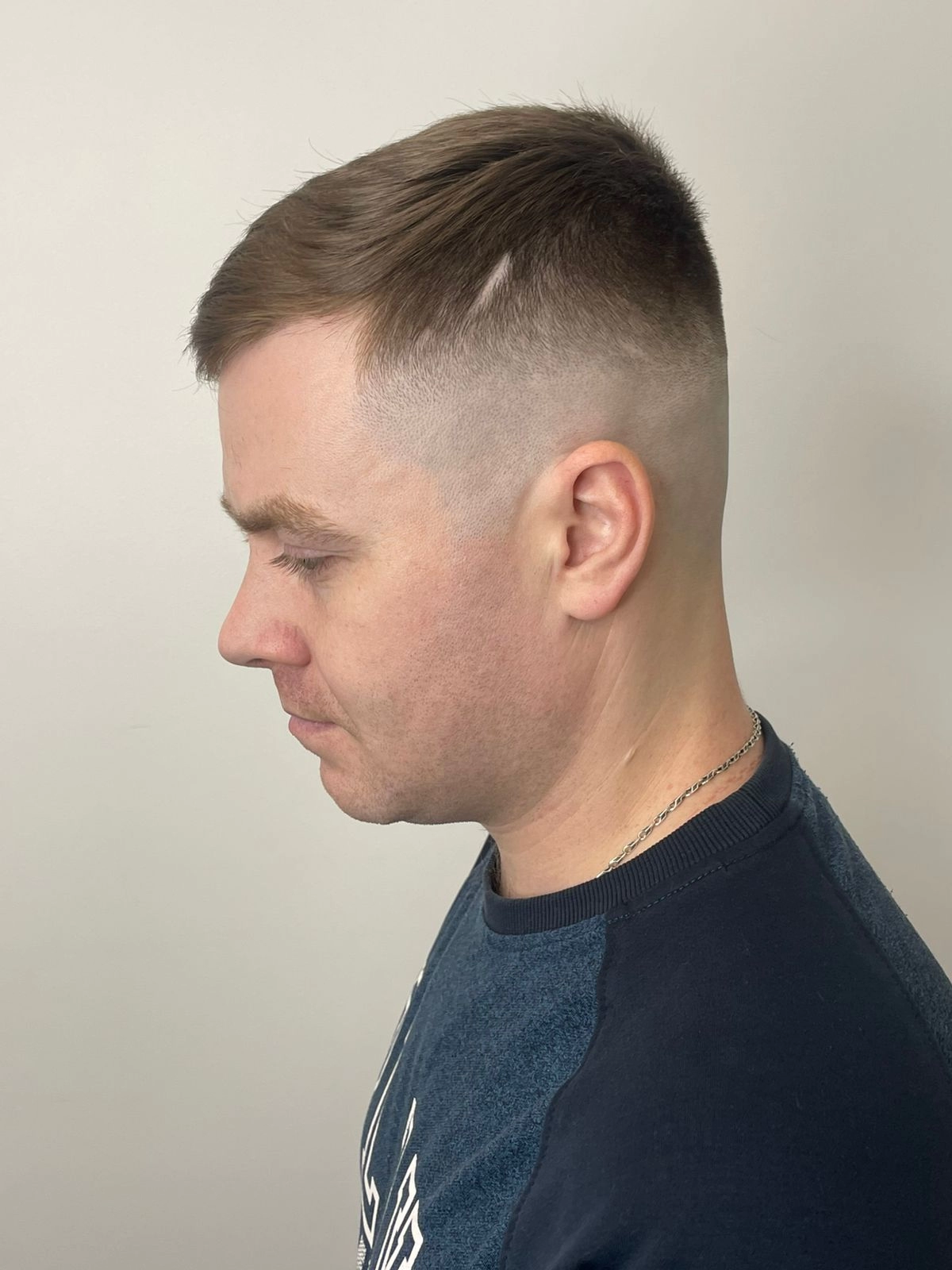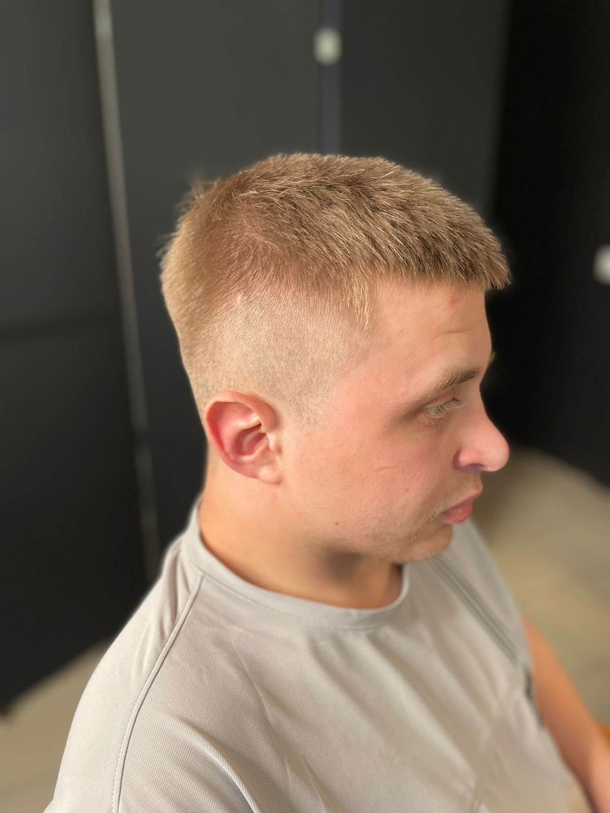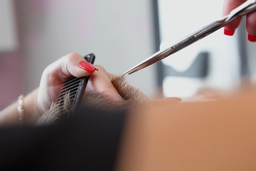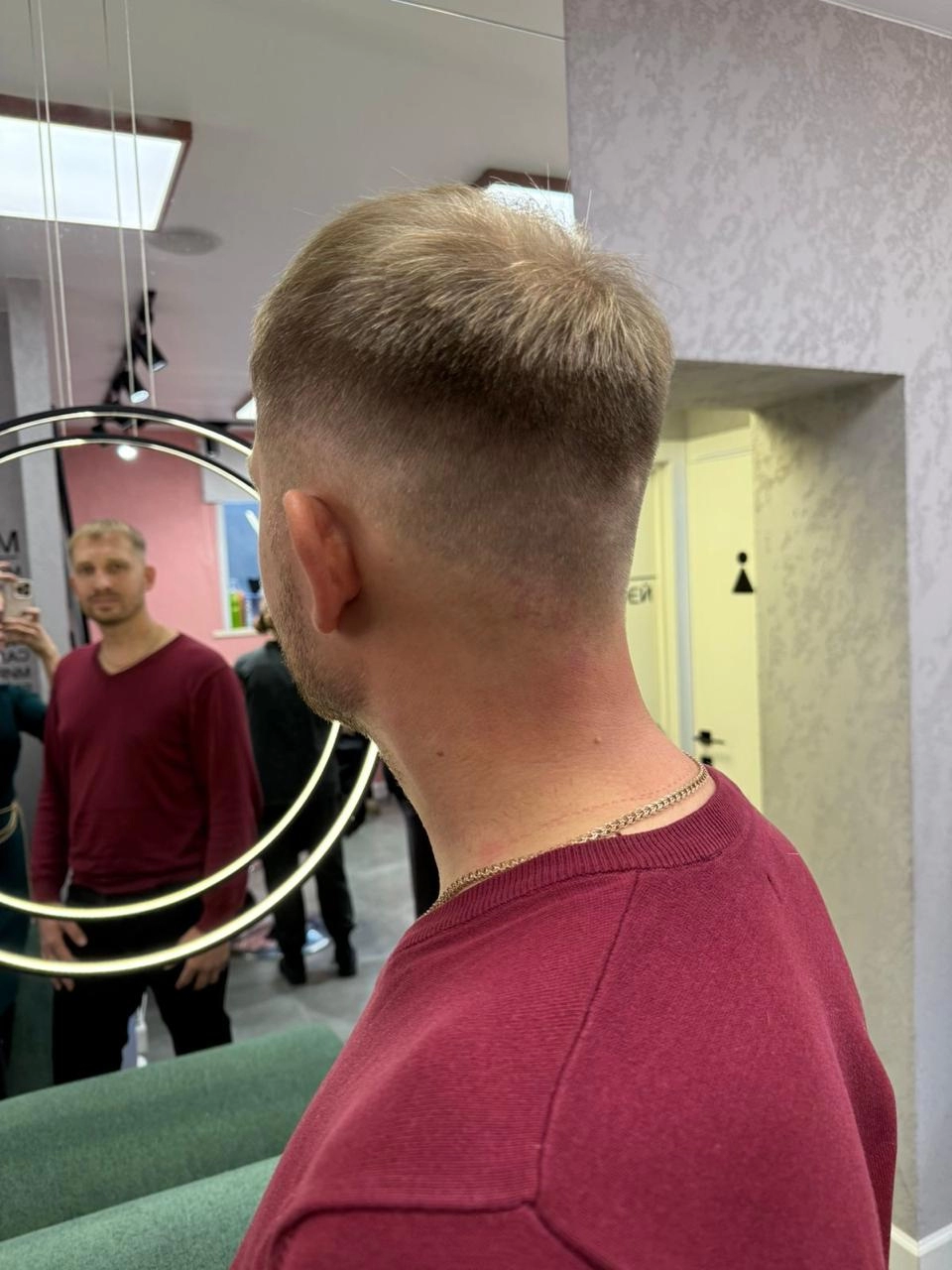 Мастер выполняет стрижку с помощью машинки, формирует общий силуэт. В этот момент можно уточнить промежуточный результат, чтобы убедиться, что процесс стрижки движется в нужном направлении.